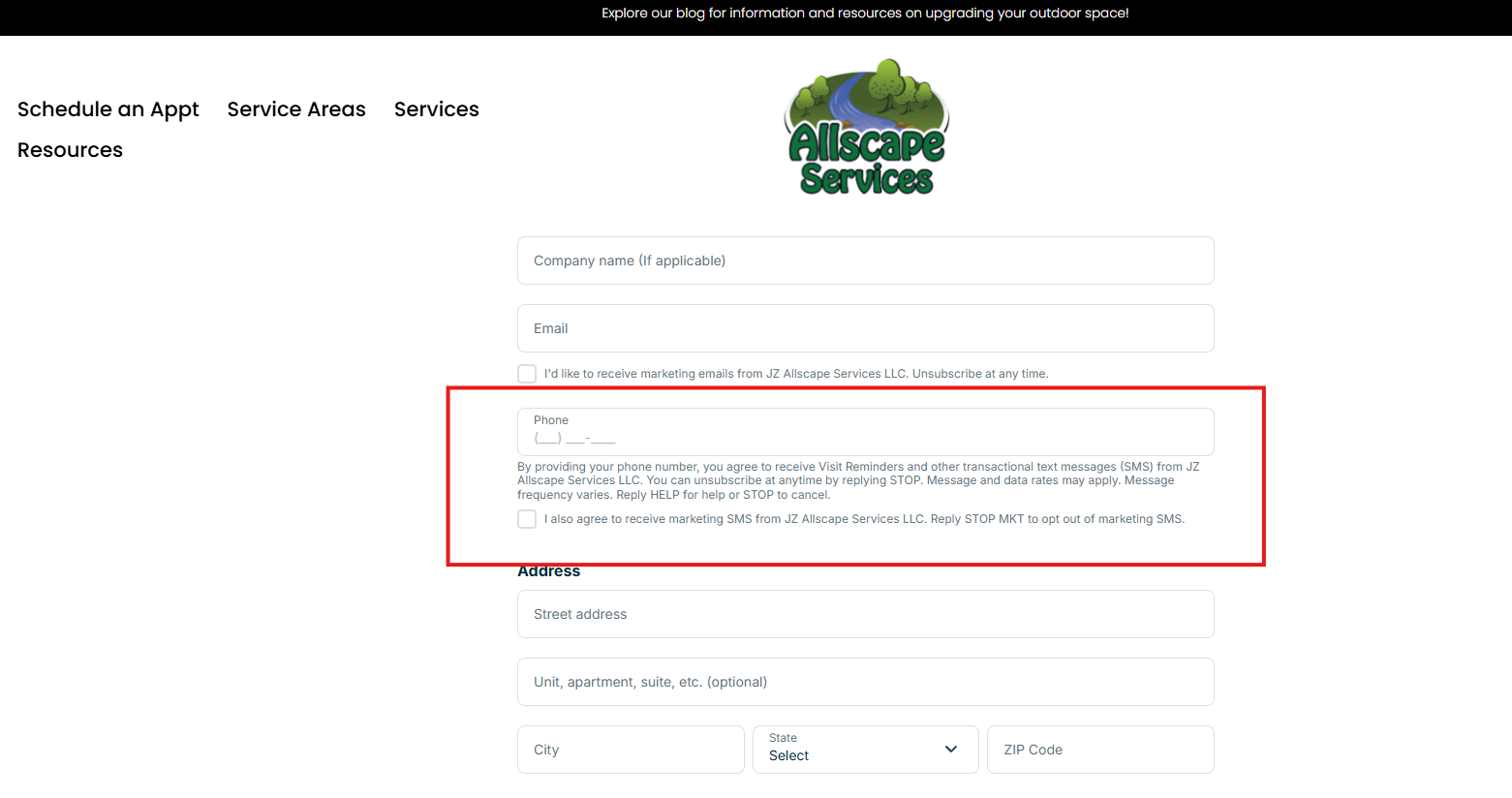 “By providing your phone number, you agree to receive Visit Reminders and other transactional text messages (SMS) from JZ Allscape Services LLC. You can unsubscribe at any time by replying STOP. Message and data rates may apply. Message frequency varies. Reply HELP for help or STOP to cancel.”